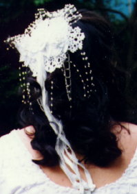 Since Laura did not want a veil, she asked me to make her a headpiece, and I found a lacy barrette patterb and then made some white crochet flowers to sew onto it. She then dangled ribbons and pearls, and added a few pearl sprays to the edges, and the result was one of the most beautiful headpieces I've ever seen. And thanks to her generosity, I ended up wearing it at my own wedding two years later! Pattern Source: Barrette: Vanessa Ann's Plain and Fancy Crochet. The pattern for the flowers on the barrette is in the ASN Bridal Thread Crochet leaflet; Annie's Attic now distributes ASN's publications.