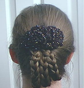 Ruffled barrette made of Lion Brand Glitter Magic yarn. Pattern Source: Original; click here for the pattern.