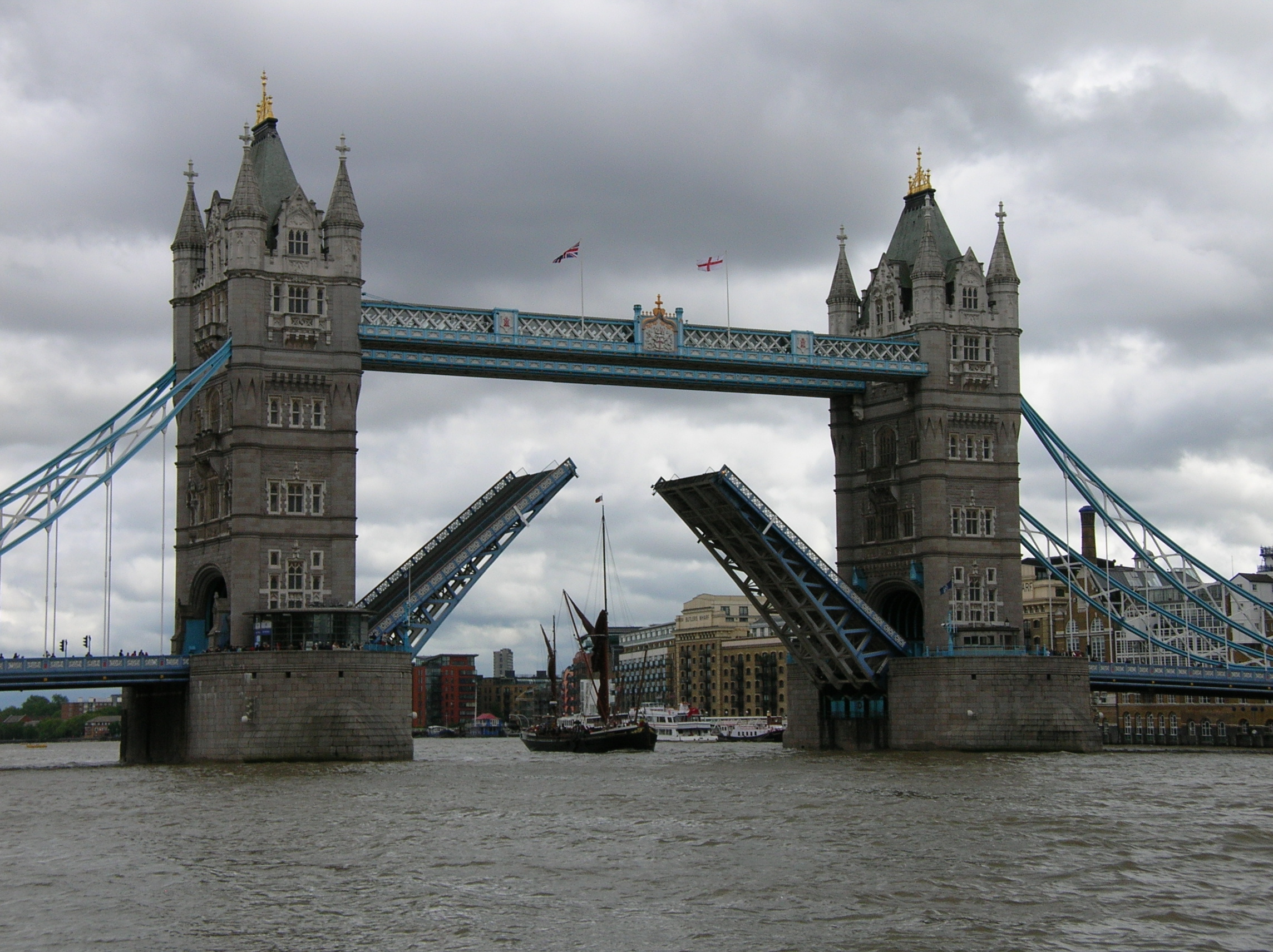Boat passing beneath the open Tower Bridge.