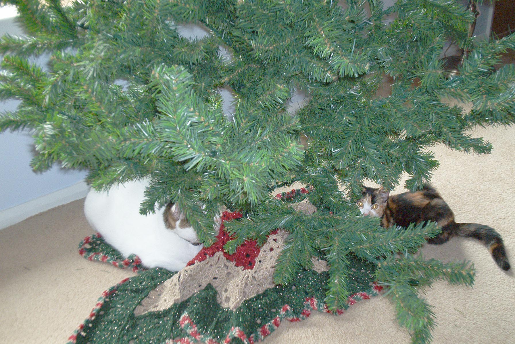 We tried to put up a Christmas tree this year, but Widget was just too fascinated. This was her tamest; mostly, she kept eating the branches and climbing the tree. So, we had to take it down; hopefully next year she'll be a little calmer. (Wembley also likes sitting under the tree but never bothers it.)