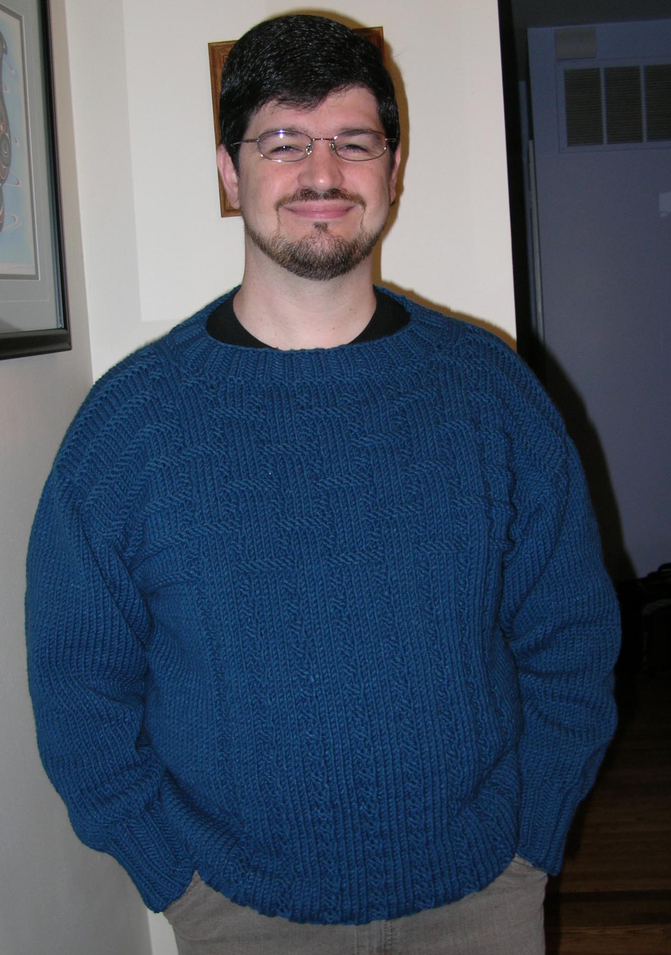 [1/22/2008] Made this out of Pure Gold Chunky yarn for Ray. Pattern Source: Woven Squares Pullover by Deb Gemmell. Available as a leaflet from Cabin Fever.