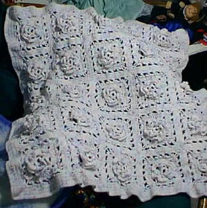 Made this for my niece. See next photo for a close-up of one of the motifs. Pattern Source: a Lion Brand Jamie yarn wrapper.
