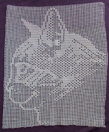[6/8/2001] Pattern Source: The Tap-Dancing Lizard by Catherine Cartwright-Jones and Roy Jones. This is really a book of knitting-machine patterns, but as the charts are all 2-color, they are perfect for filet crochet.