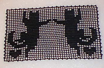 Pattern Source: The Tap-Dancing Lizard by Catherine Cartwright-Jones and Roy Jones. This is really a book of knitting-machine patterns, but as the charts are all 2-color, they are perfect for filet crochet.